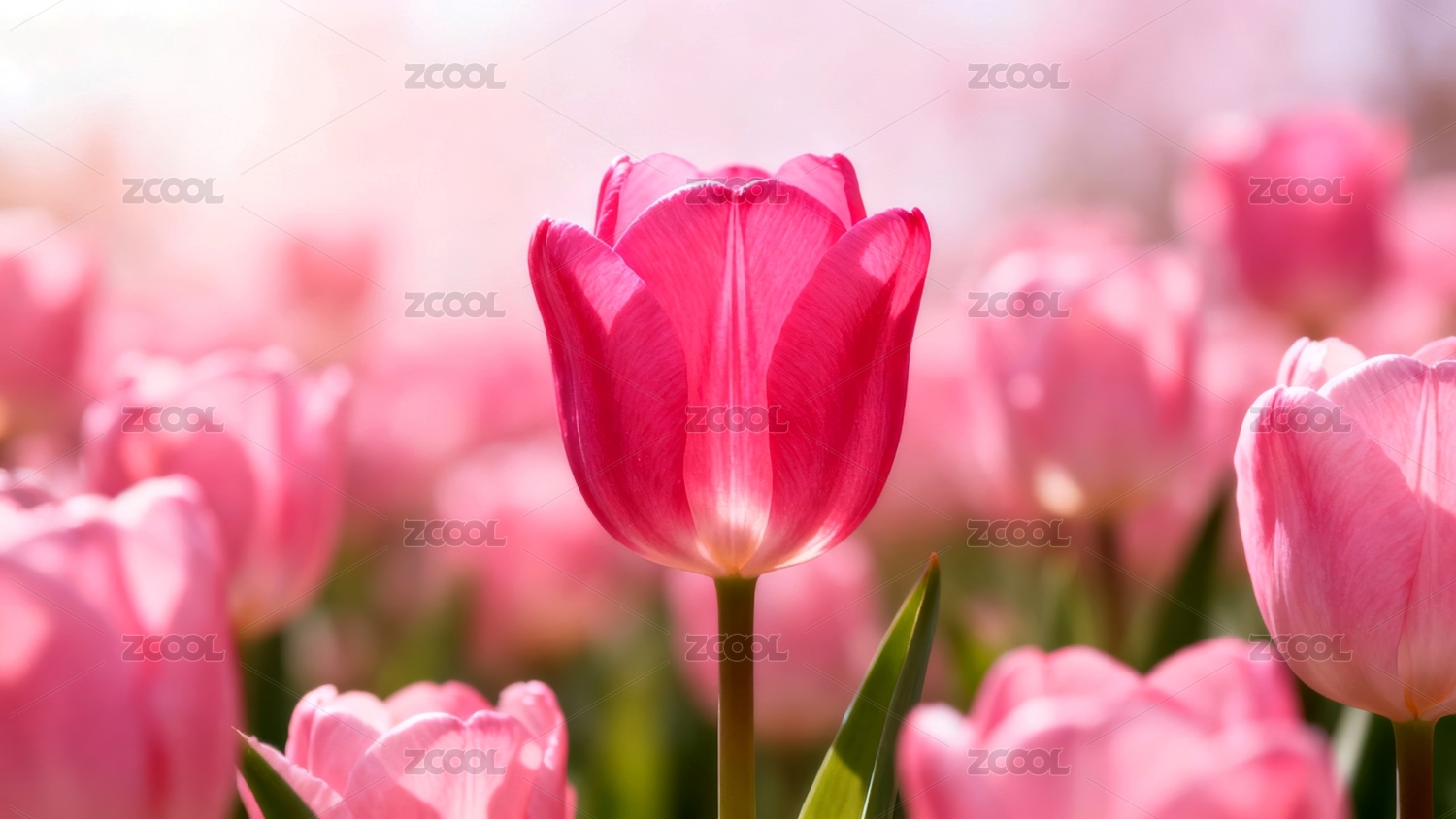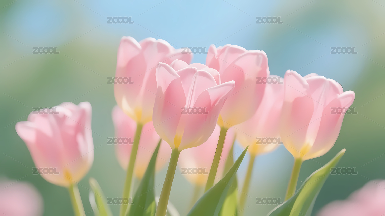 粉色郁金香与绿色植物背景