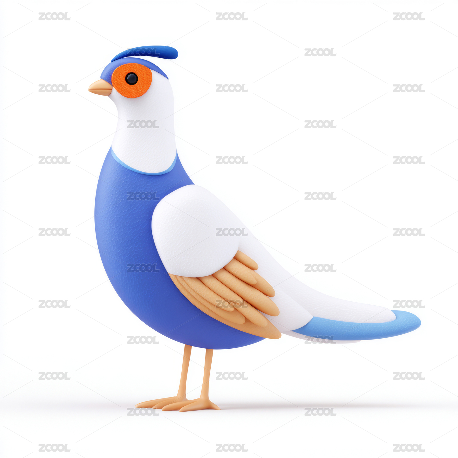 蓝色卡通鸽子站在白色平面上