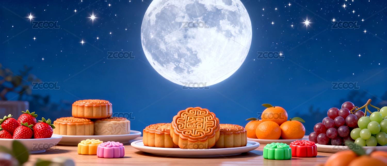 多彩月饼与弯月云朵背景组合中秋节3D场景