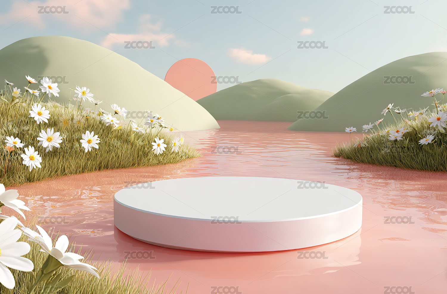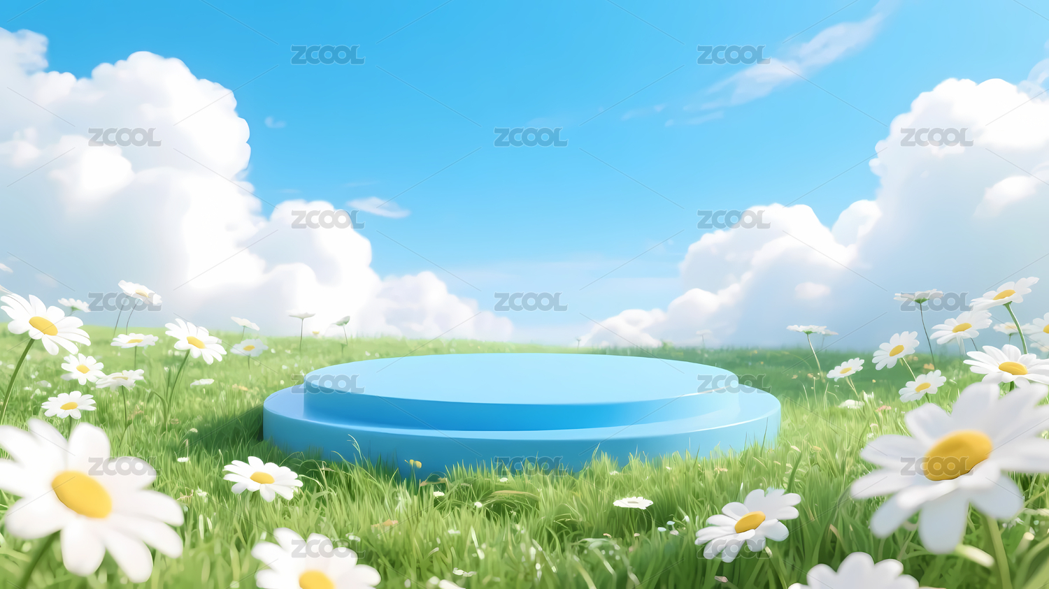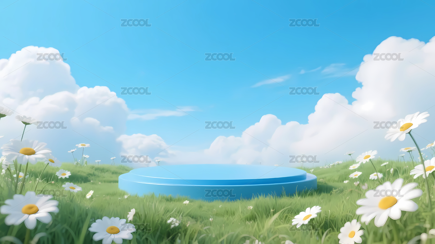 绿色,草地,平台,圆形,粉色,柔和,花朵,蓝天,白云,明亮