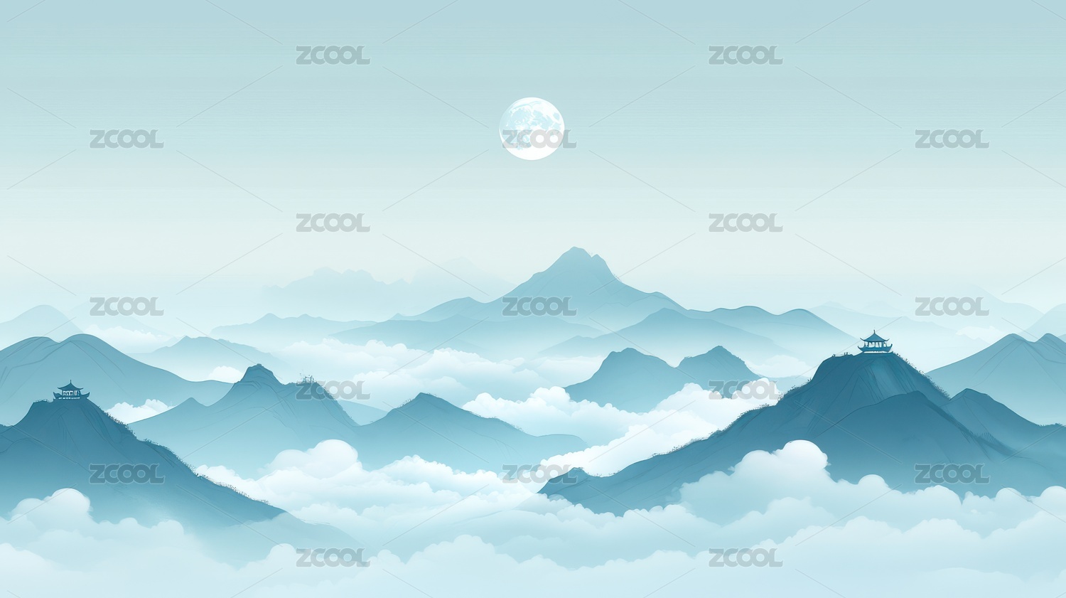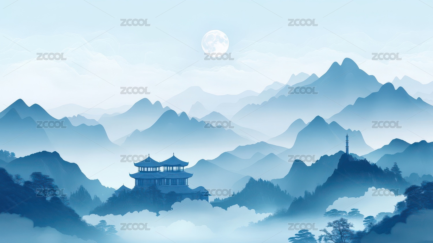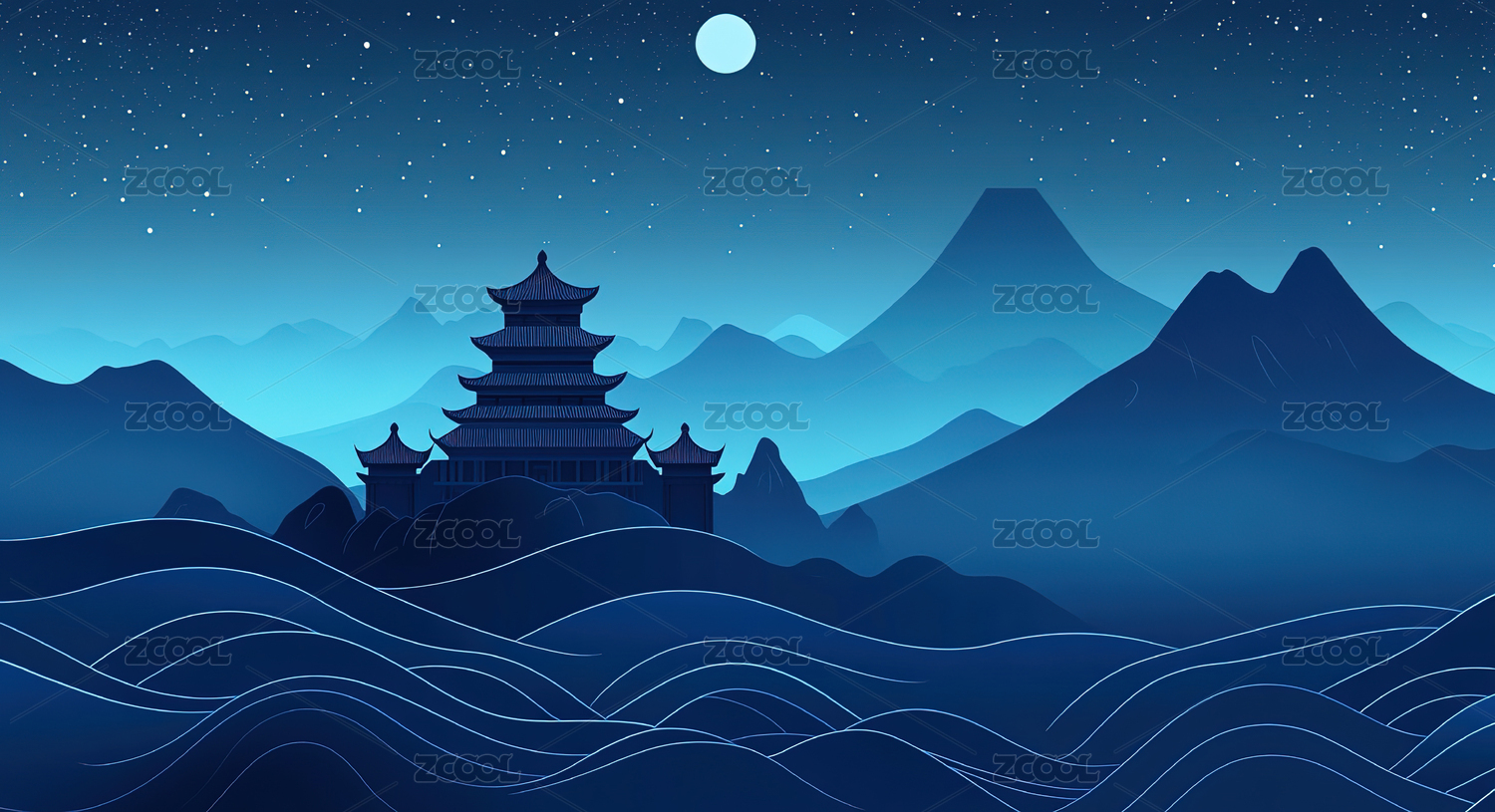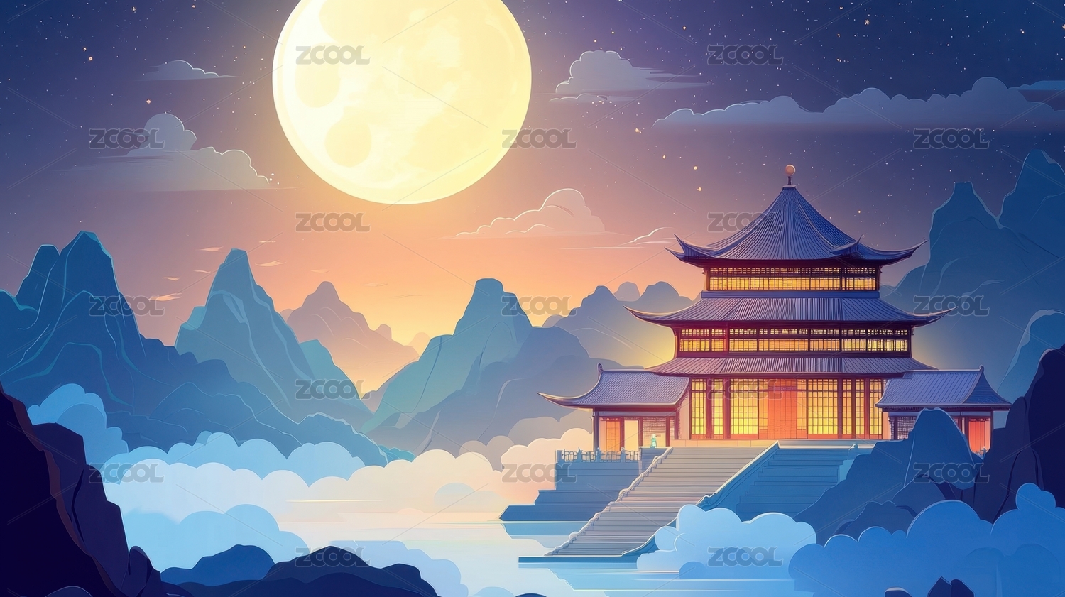月亮,夜景,古建筑,中式,云雾,山峦,星空,唯美,意境,朦胧