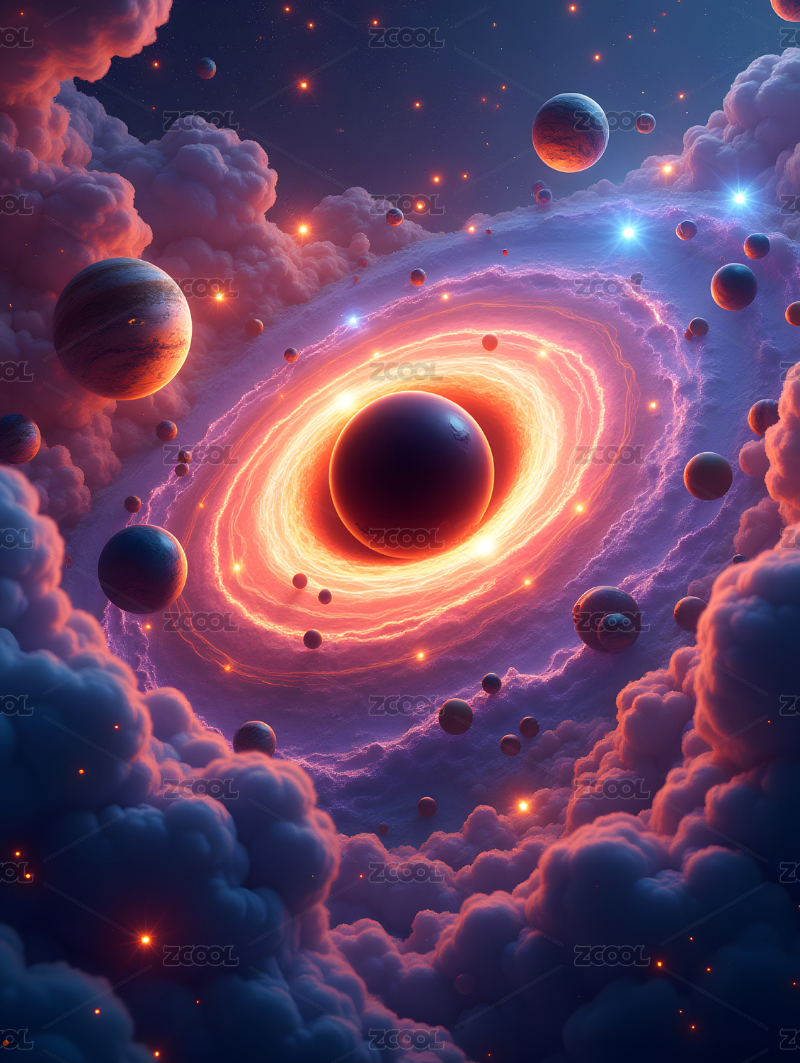 科幻宇宙中环绕星球的黑洞景象