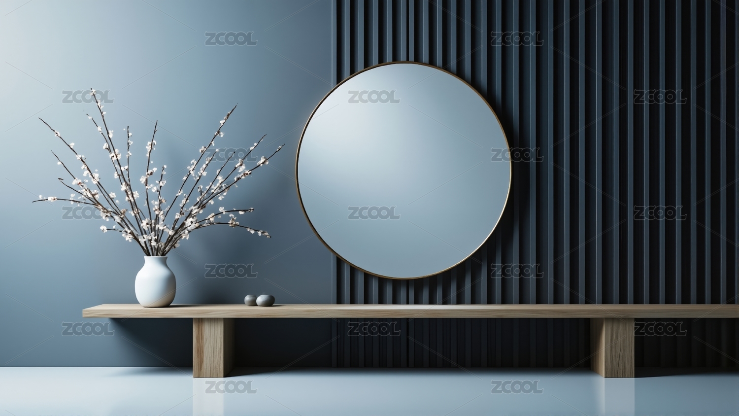 简约,现代,室内,装饰,蓝色,墙面,镜子,柜子,花瓶,干花