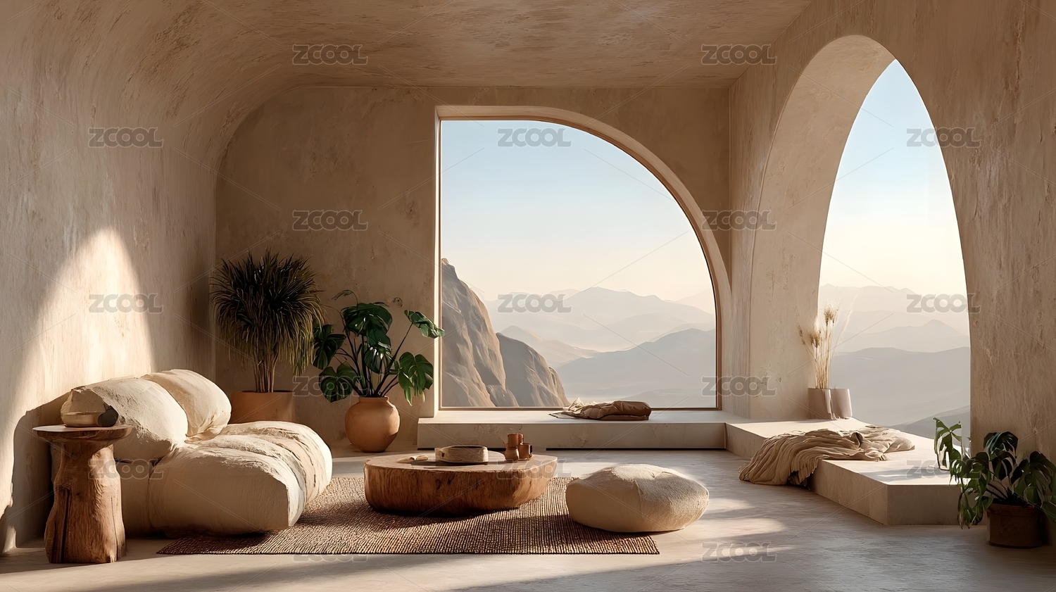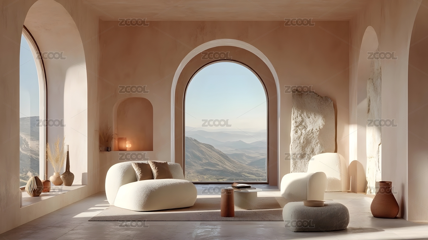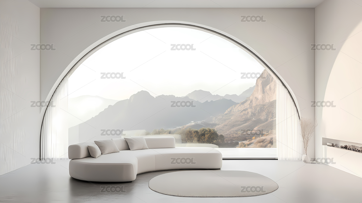 简约,现代,客厅,设计,拱形窗户,自然景观,室内装饰,舒适座椅,圆形茶几,吊灯