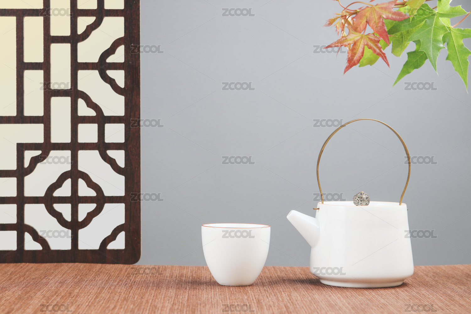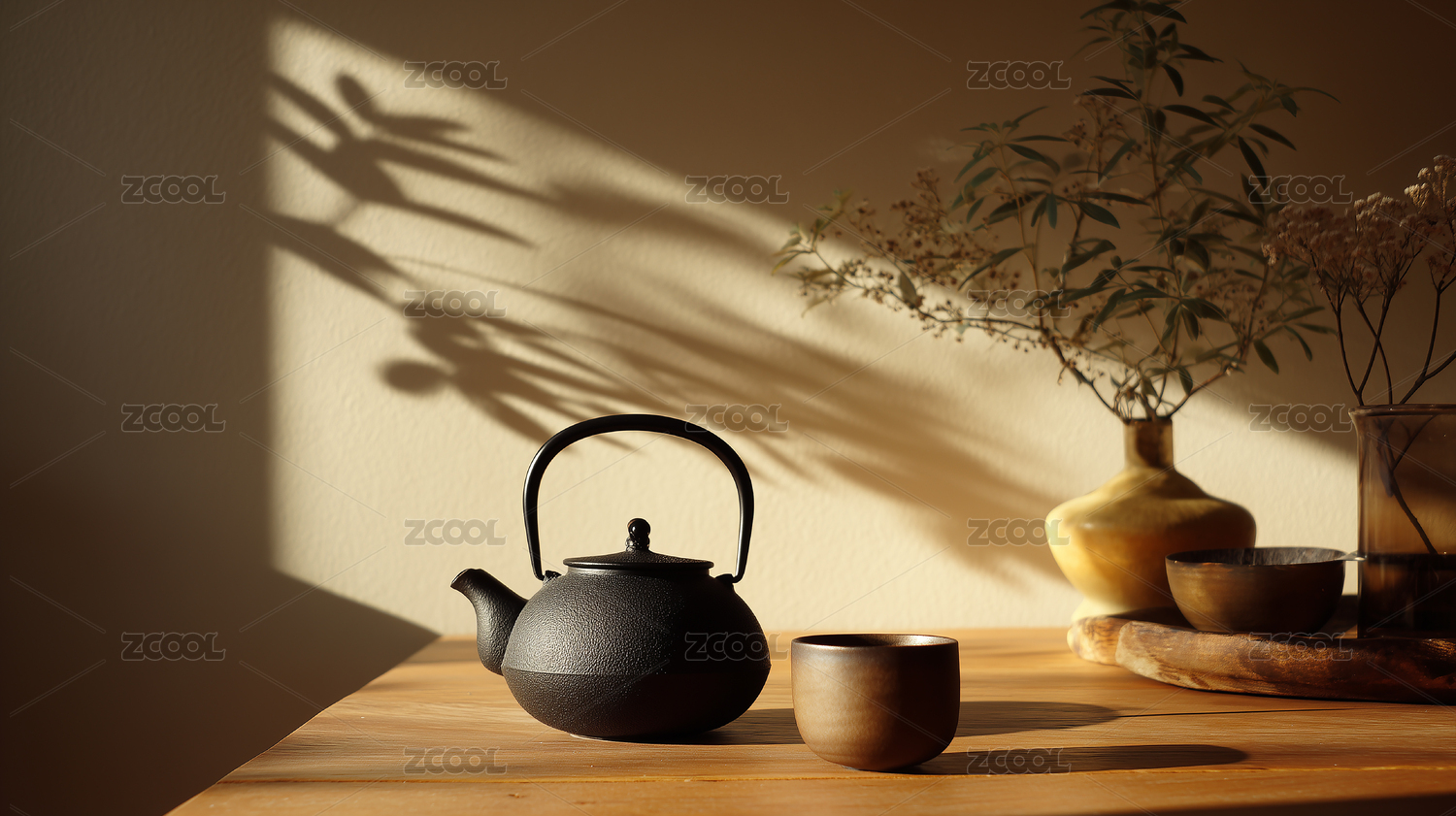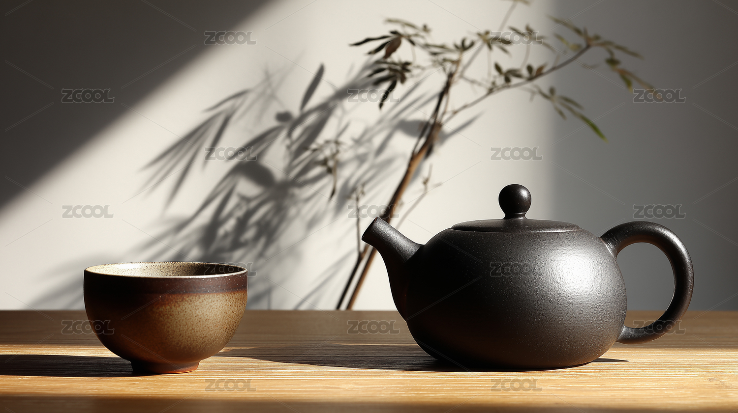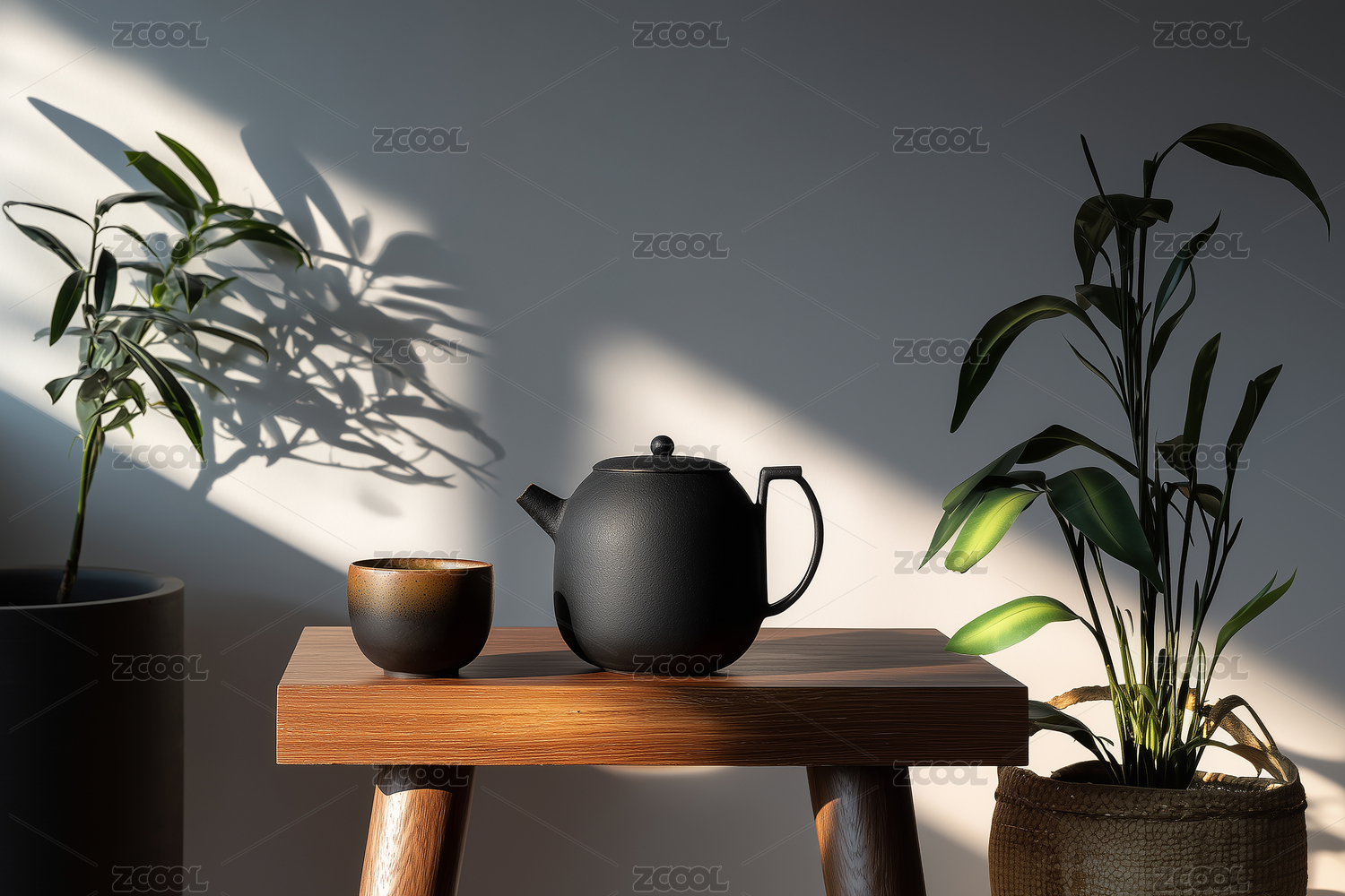 现代,亚洲,茶艺,布置,哑光,黑色,茶壶,柔和,棕色,杯子