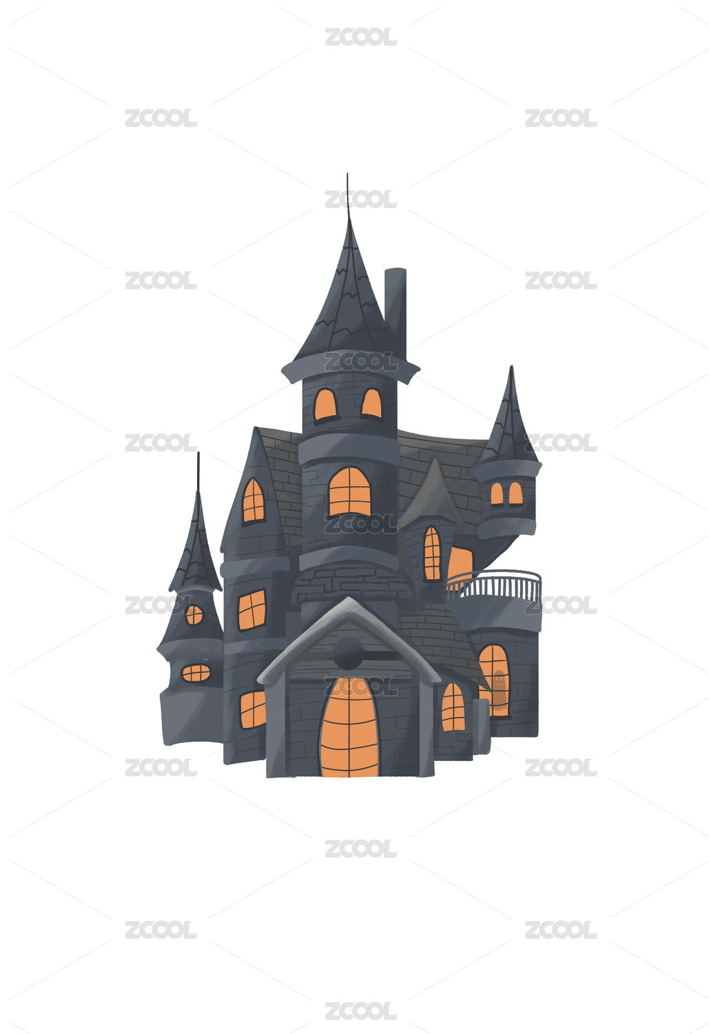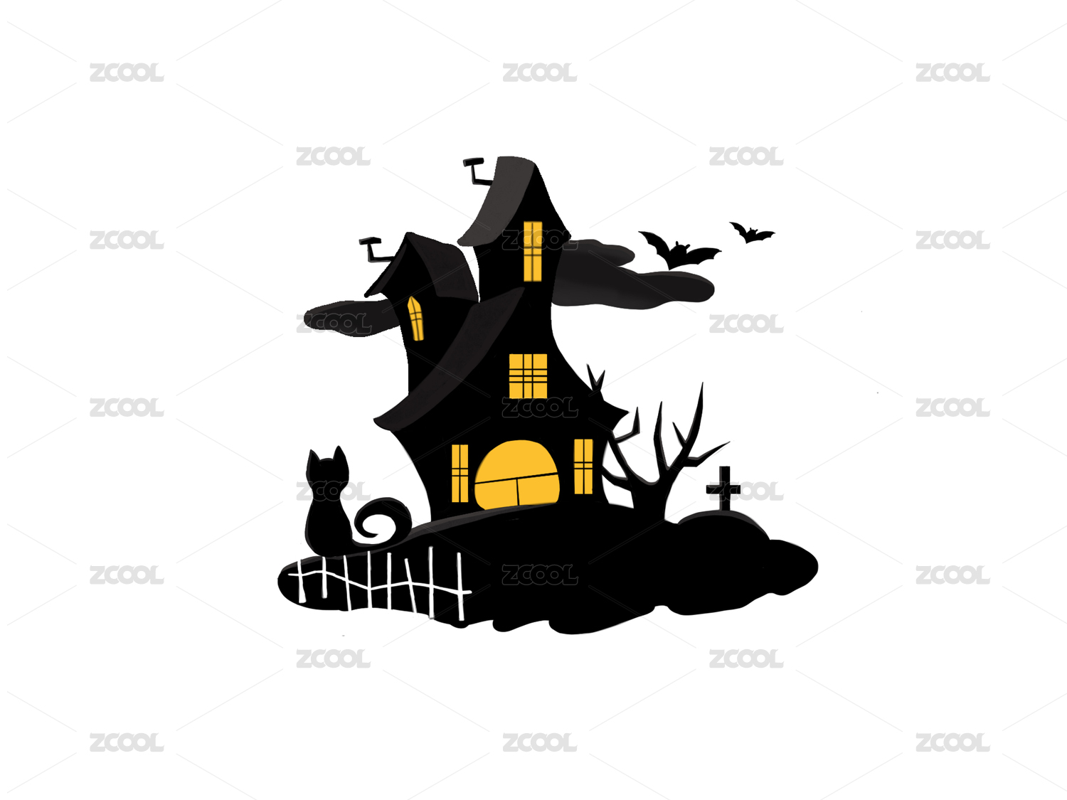 黑黄色万圣节城堡蝙蝠女巫骑扫把剪影元