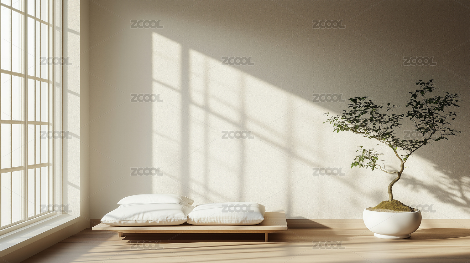 融合,家具,浅木,米墙,自然,阴影,无叶,陶瓶,挂画,禅意