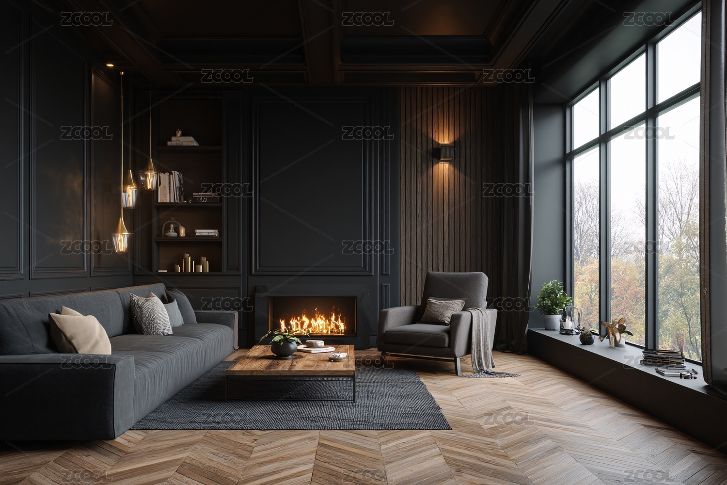 深色调,优雅,客厅,拱形,壁炉,定制,书架,温暖,氛围灯,照明
