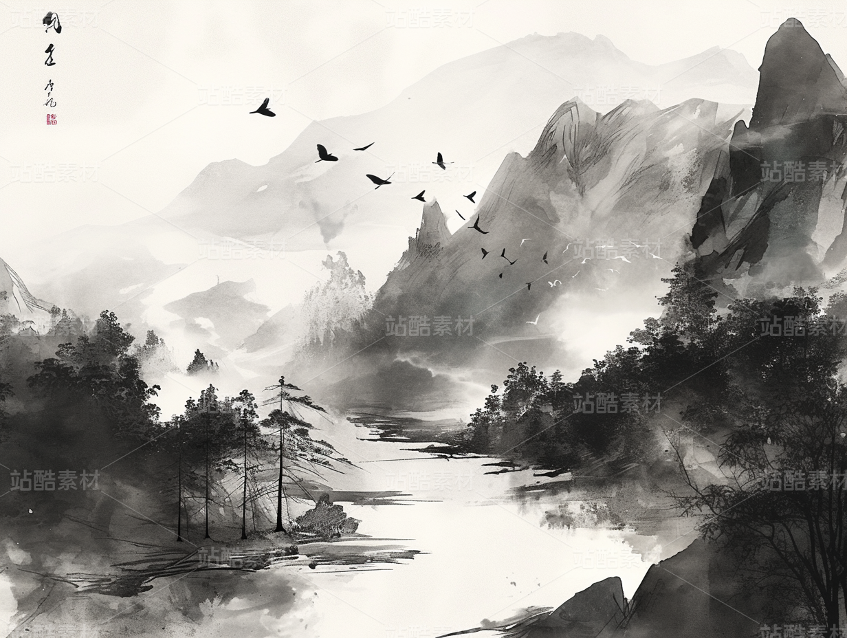 写意山水花鸟新中式水墨花鸟水墨山水花鸟画国画山水画