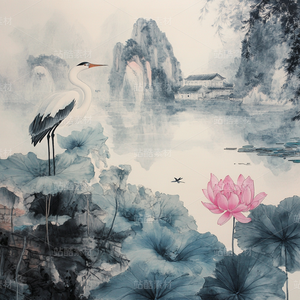 中国传统水墨画国画工笔画白鹤站在荷花池