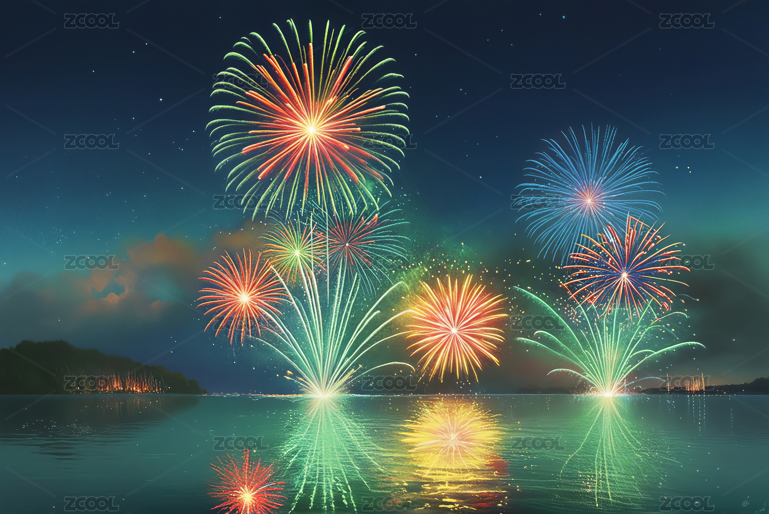 烟花, 夜空, 湖面, 倒影, 色彩, 闪烁, 节日, 庆典, 光芒, 璀璨