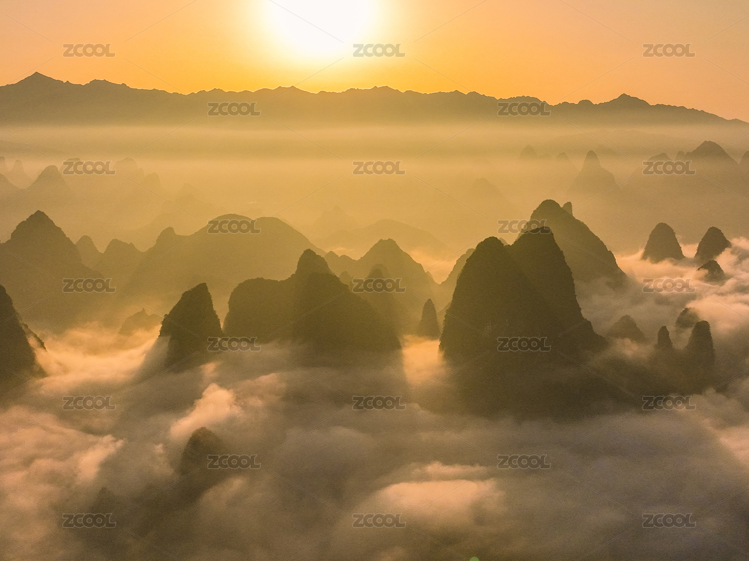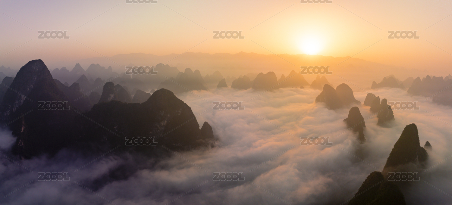 航拍中国广西桂林日出时喀斯特山脉晨雾风光