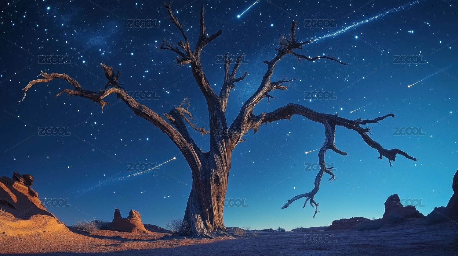荒漠中一棵枯树的上空横贯着一片绚丽的星云