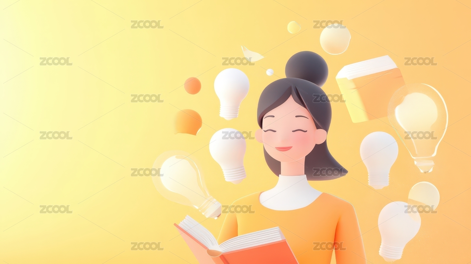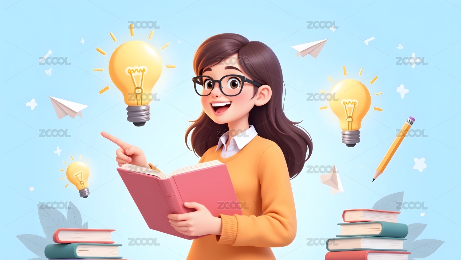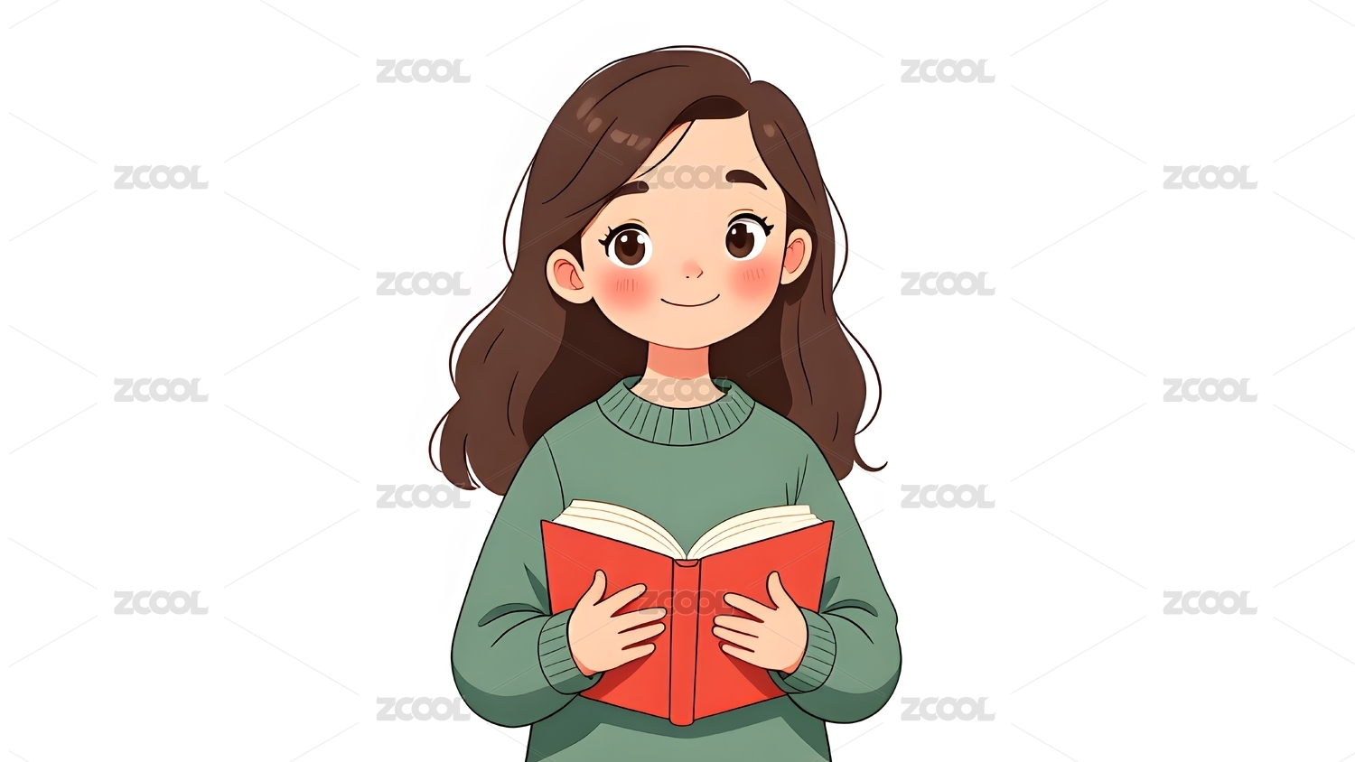 清新明亮白底胸前抱着书的亚洲女孩插画绘画