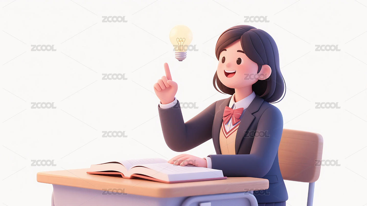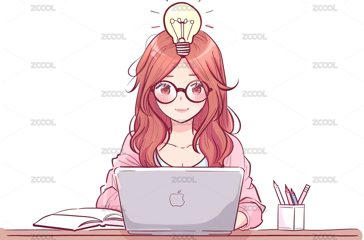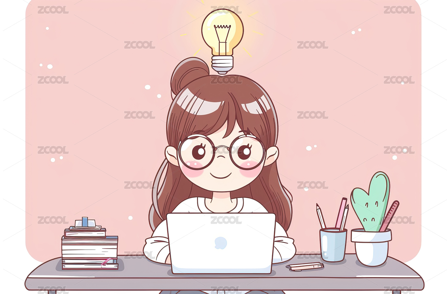 清新明亮白底胸前抱着书的亚洲女孩插画绘画