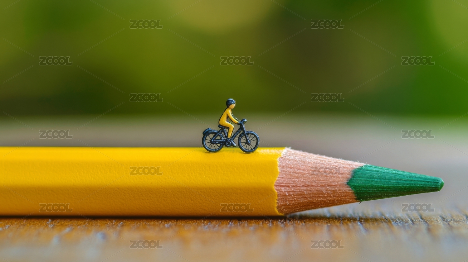 打开的空白古书上一支铅笔铅笔上一排骑行的