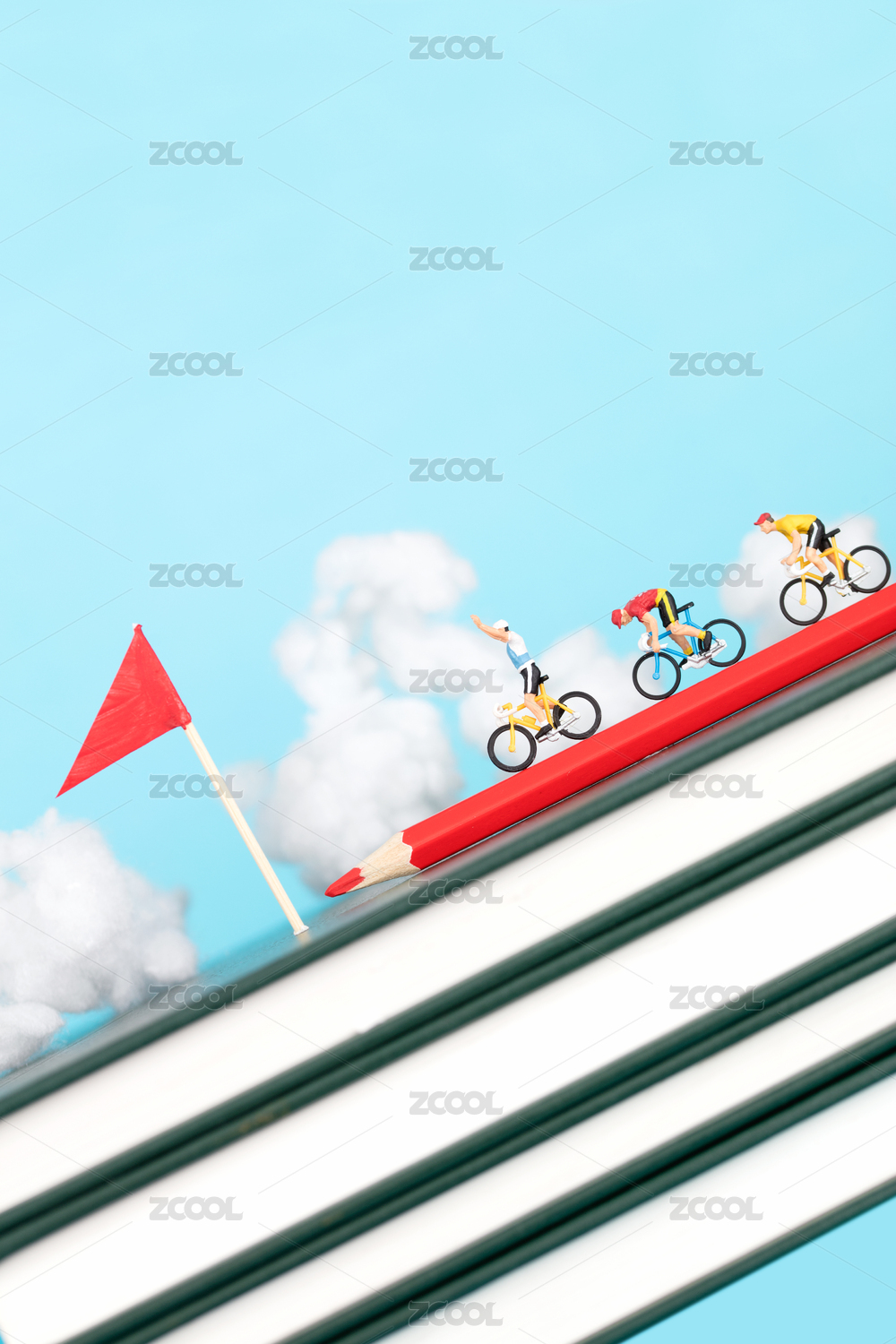 微缩创意骑着自行车在课本上加速冲刺的考生