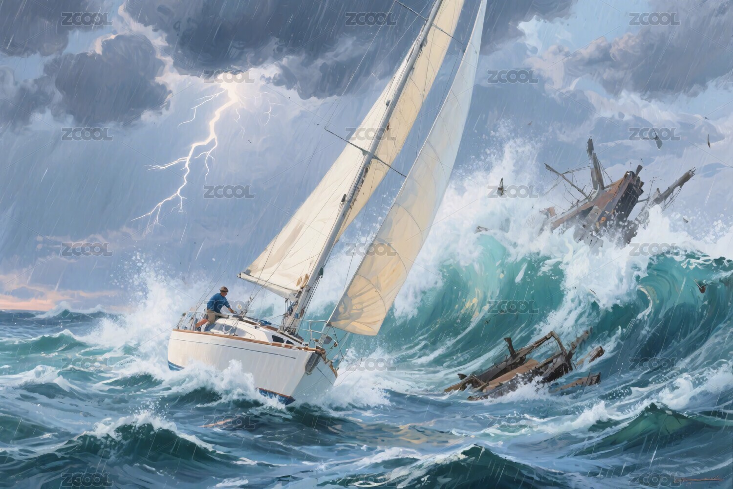 海上帆船遭遇暴风雨场景