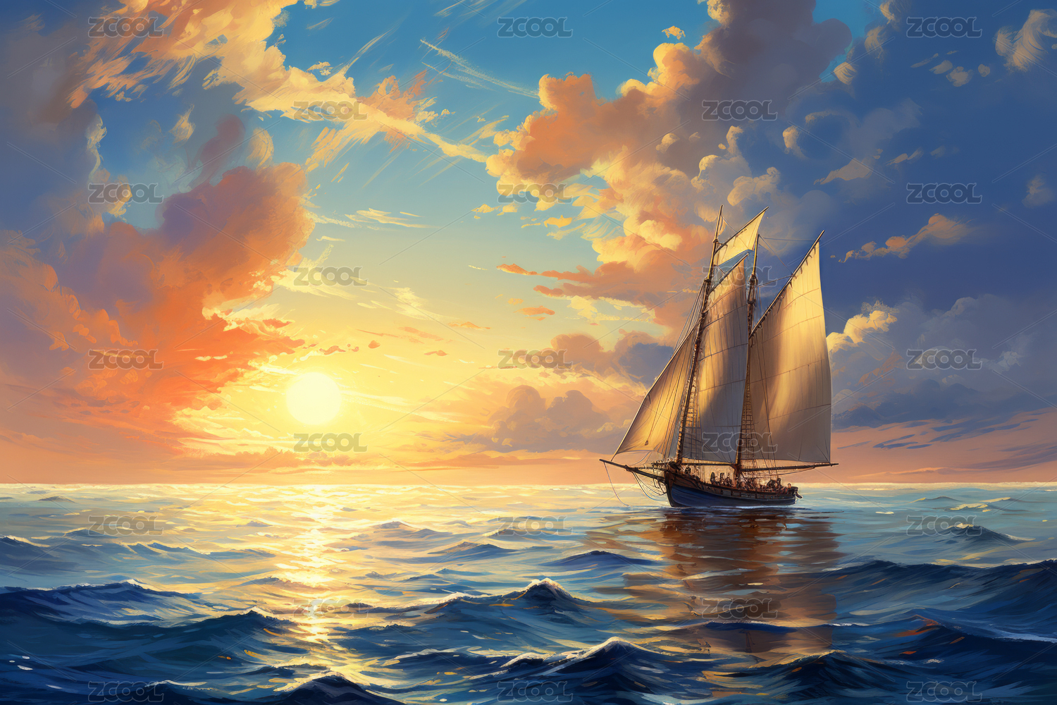 夕阳下的帆船与波涛