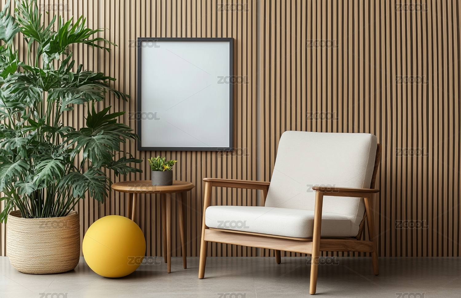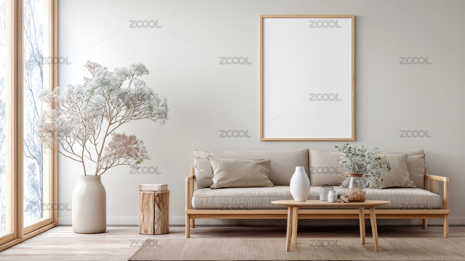 室内设计,家居布置,生活空间,温馨氛围,木质地板,单人沙发,空画框,装饰花瓶,圆形茶几,自然光线