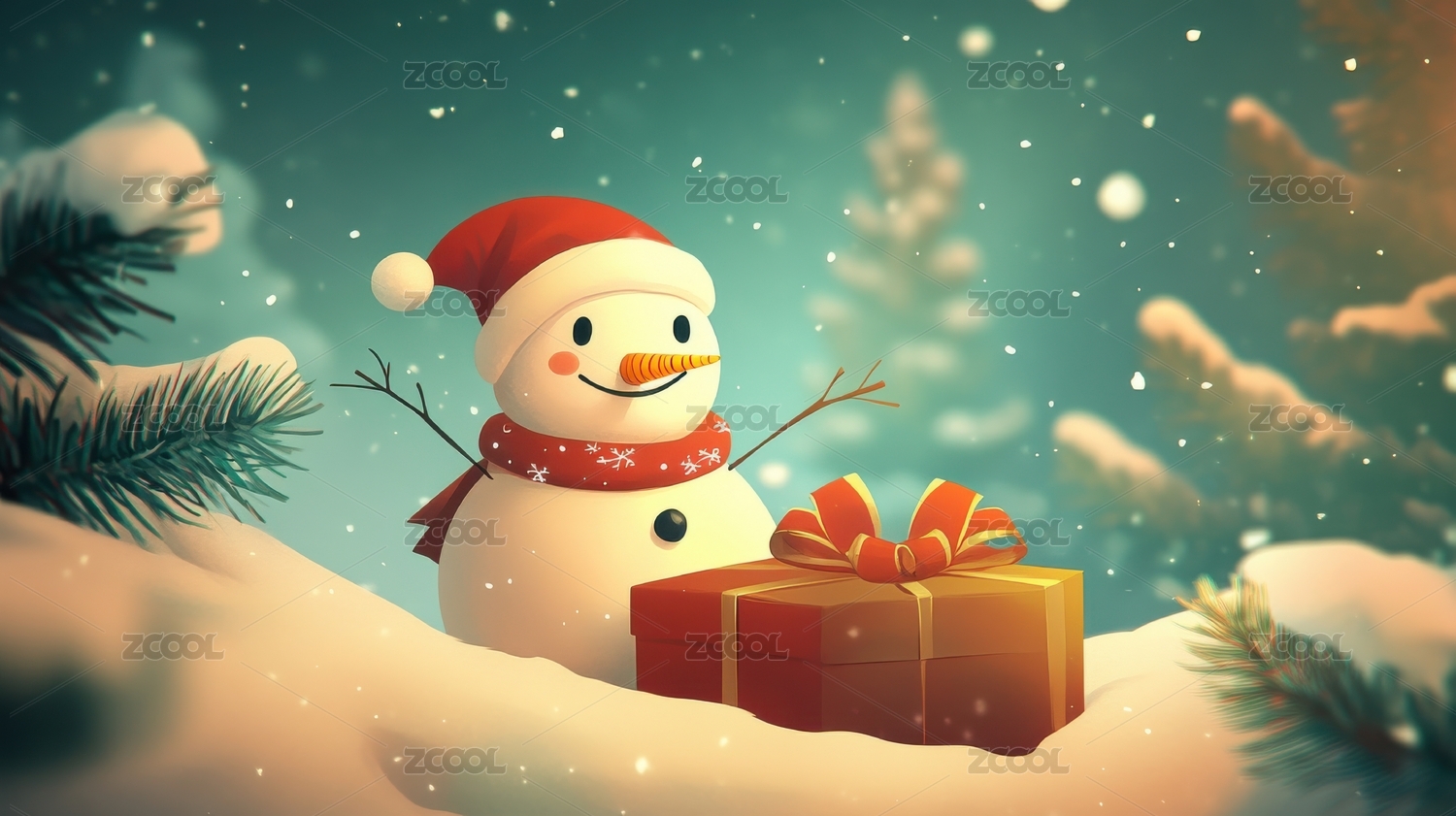 雪人怀抱礼物盒冬夜温馨场景