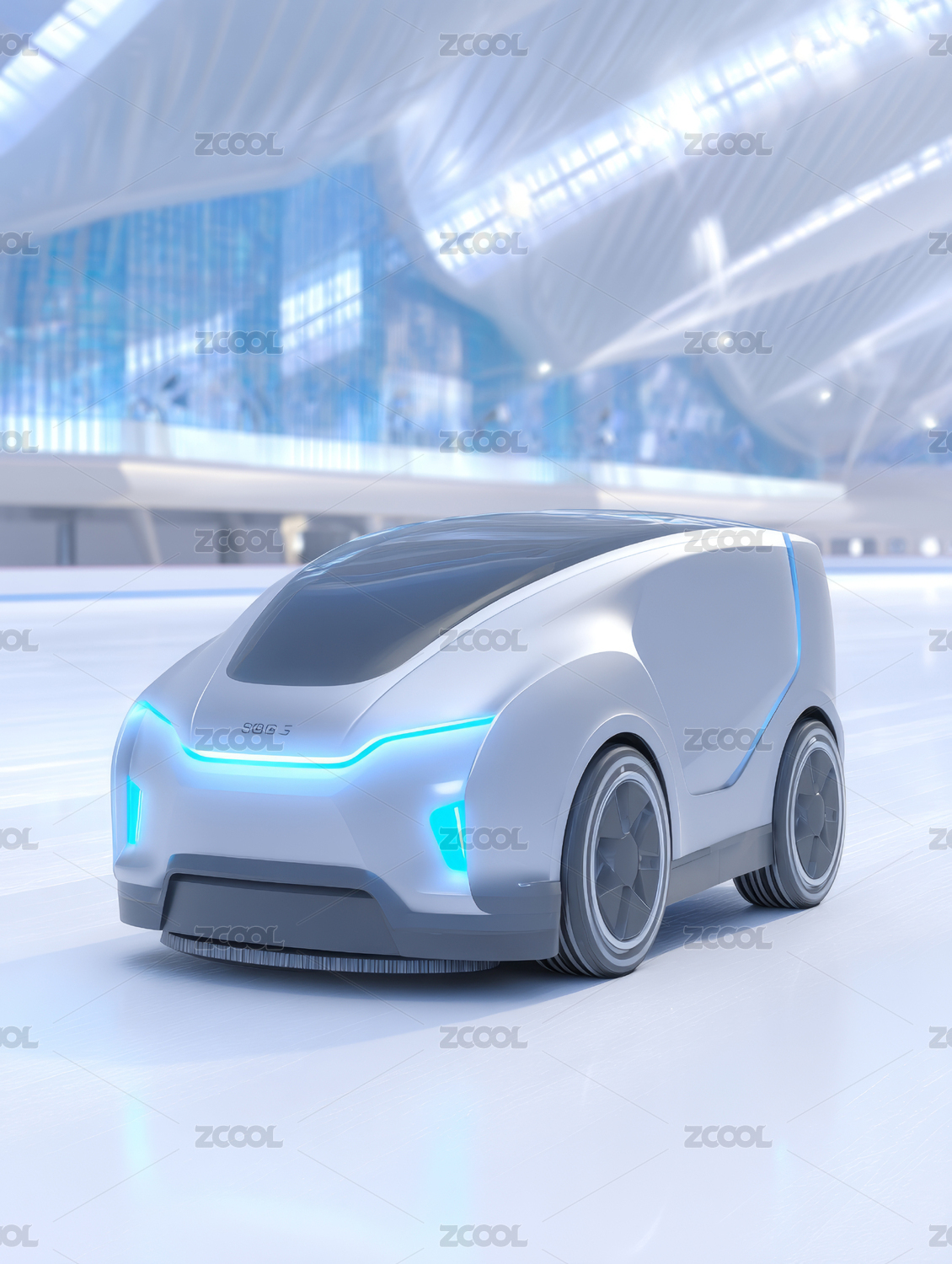 未来汽车,智能科技,现代风格,自动驾驶,流线设计,白色车身,黑色车顶,圆形轮胎,简洁内饰,室内展示
