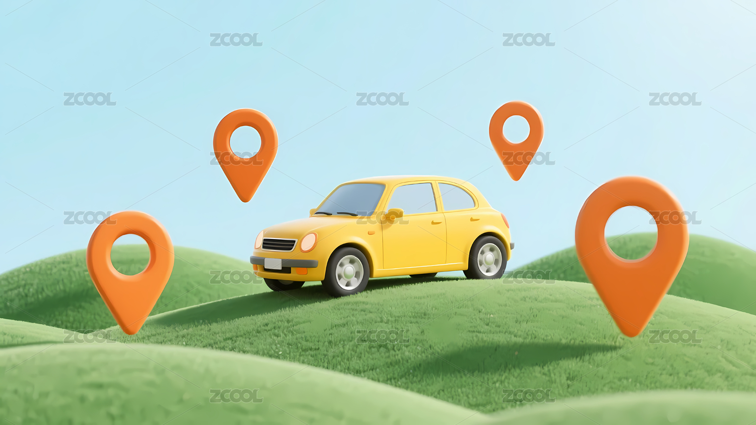 橙色,绿色,蓝天,黄色,小汽车,山丘,定位,图标,车辆,车