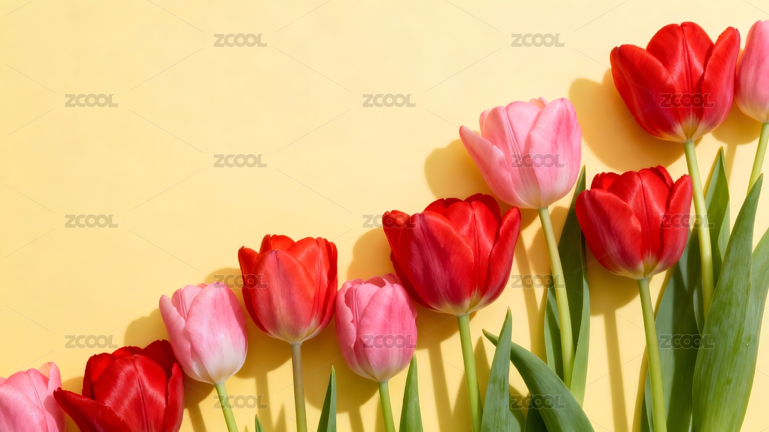 红粉郁金香排列黄色背景