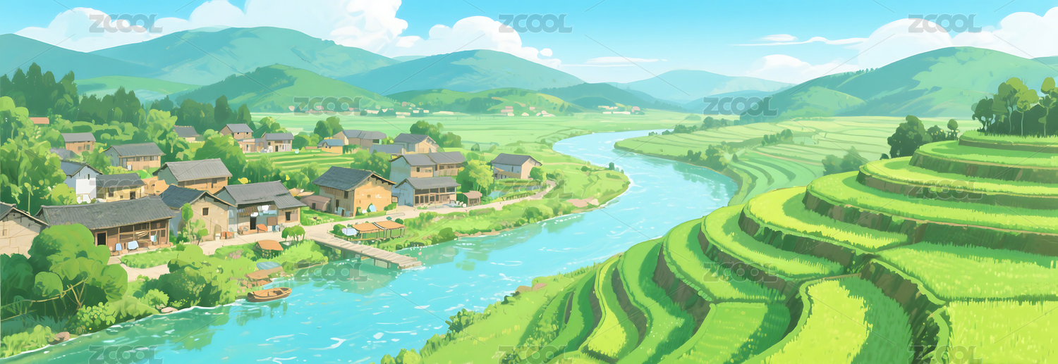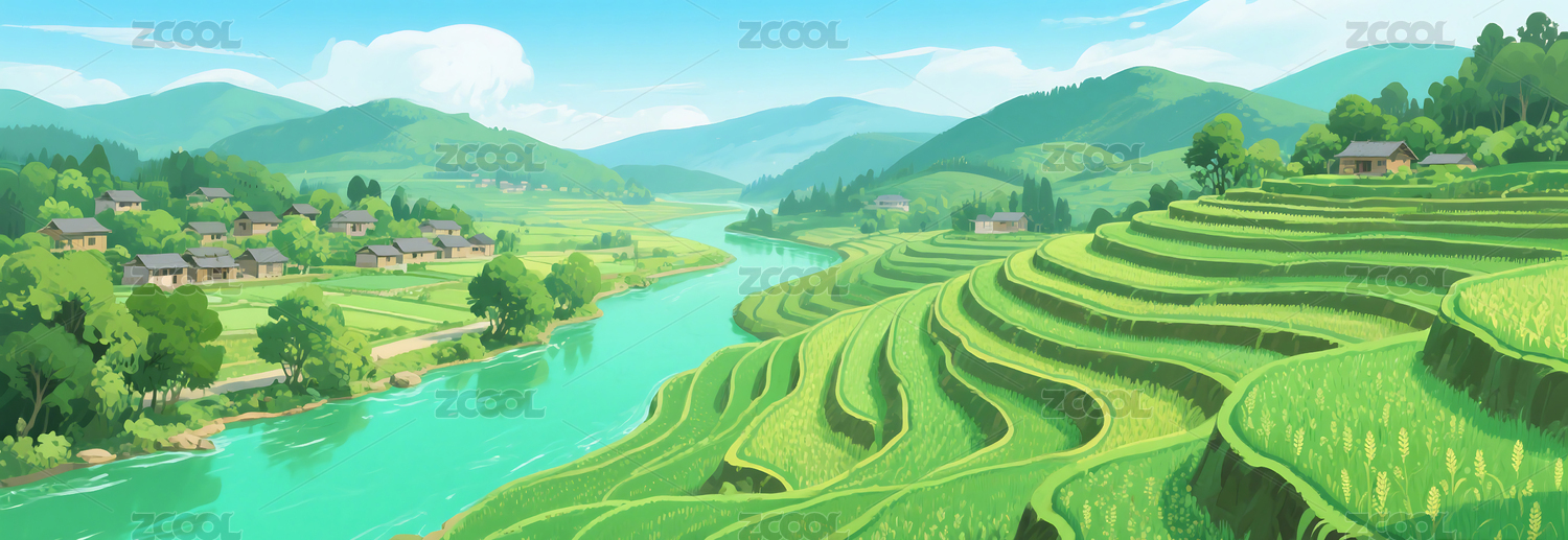 梯田,田园,插画,清新,河流,农业