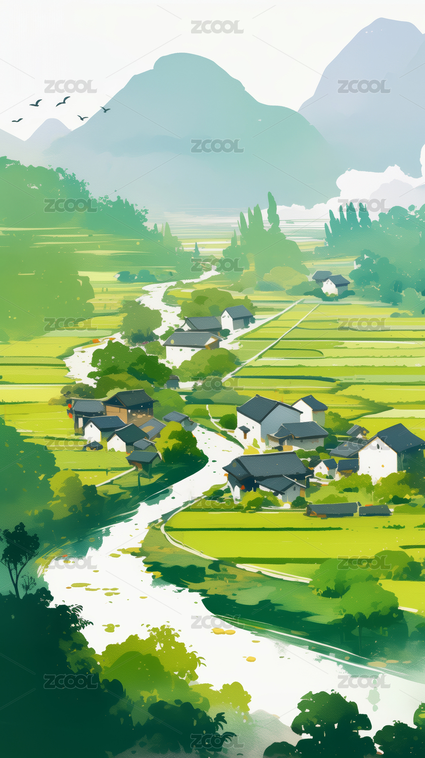 春天绿色山水田园卡通风景插画