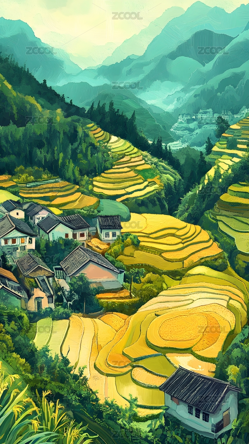 梯田村庄水彩风