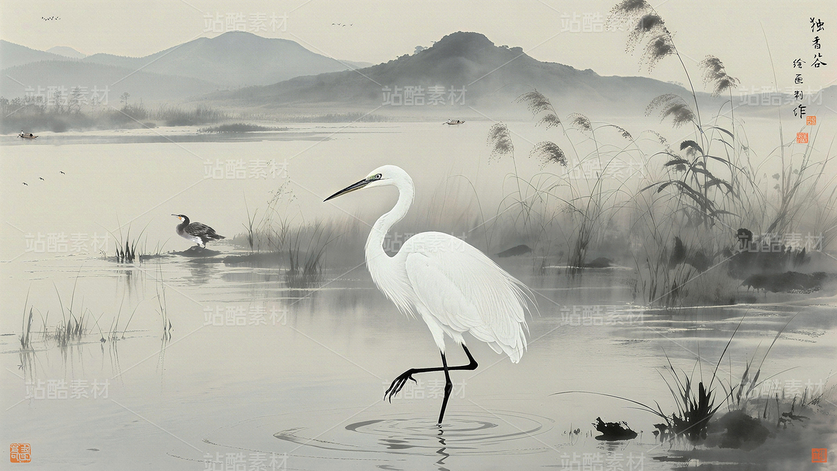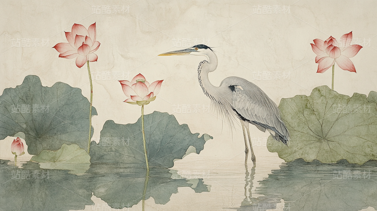 中国传统水墨画国画工笔画苍鹭站在荷花池