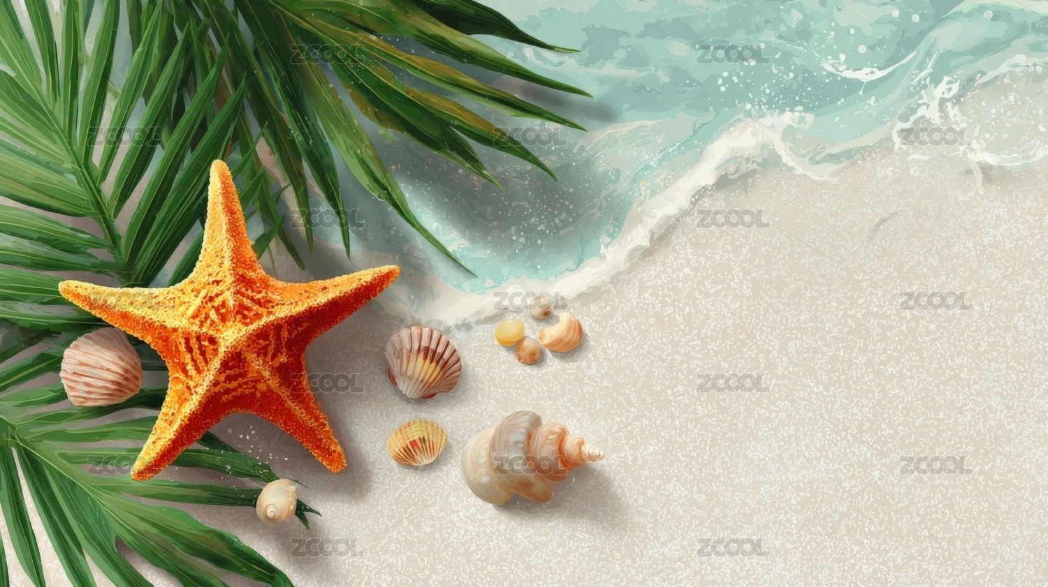 海边海浪冲进有还行的沙滩手绘水彩插画