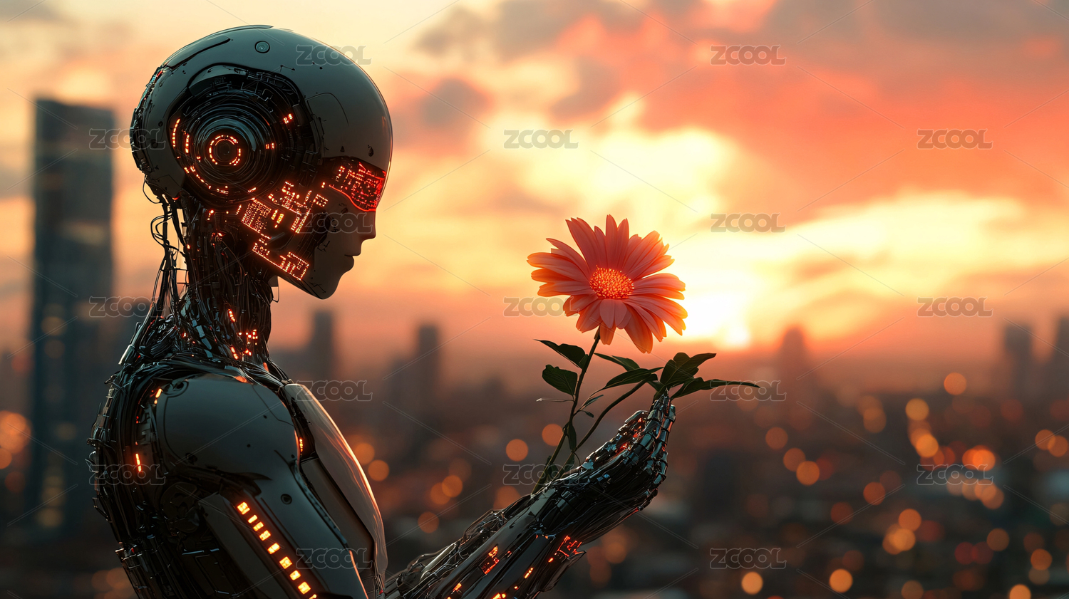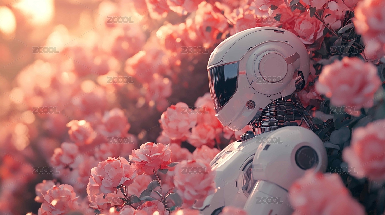 机器人与落日下的花朵
