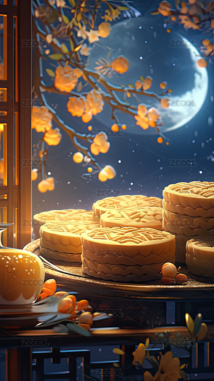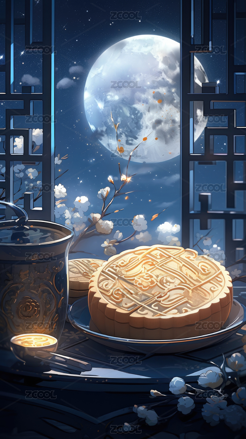 中秋节紫色中式月亮下的月饼桂花树云雾插画