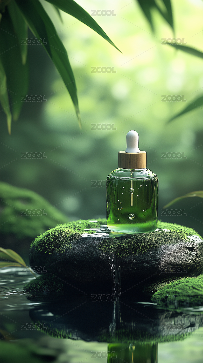 美容滴管玻璃化妆瓶在绿色水波背景中