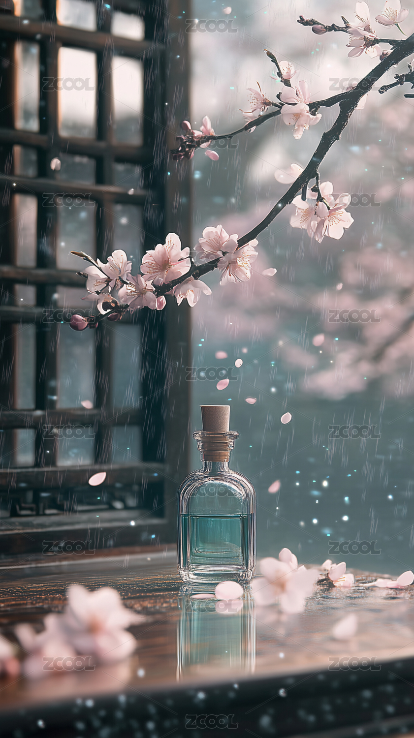 金色香水瓶与樱花盛开