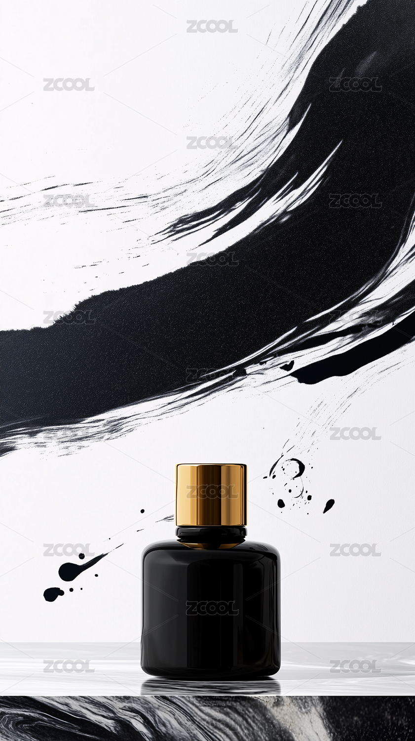 黑色泵瓶置于山水背景中
