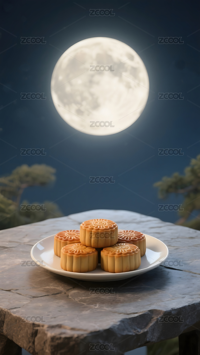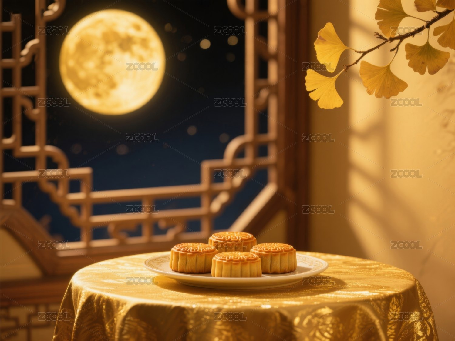 主视觉,中秋,场景,背景,餐桌,温馨,夜景,月亮,月饼,花卉