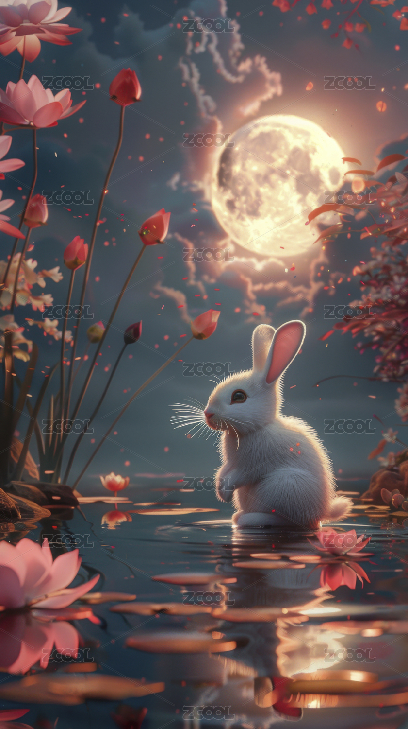主视觉,玉兔,清新,月夜,场景,月亮,桂花,插画,国风,传统