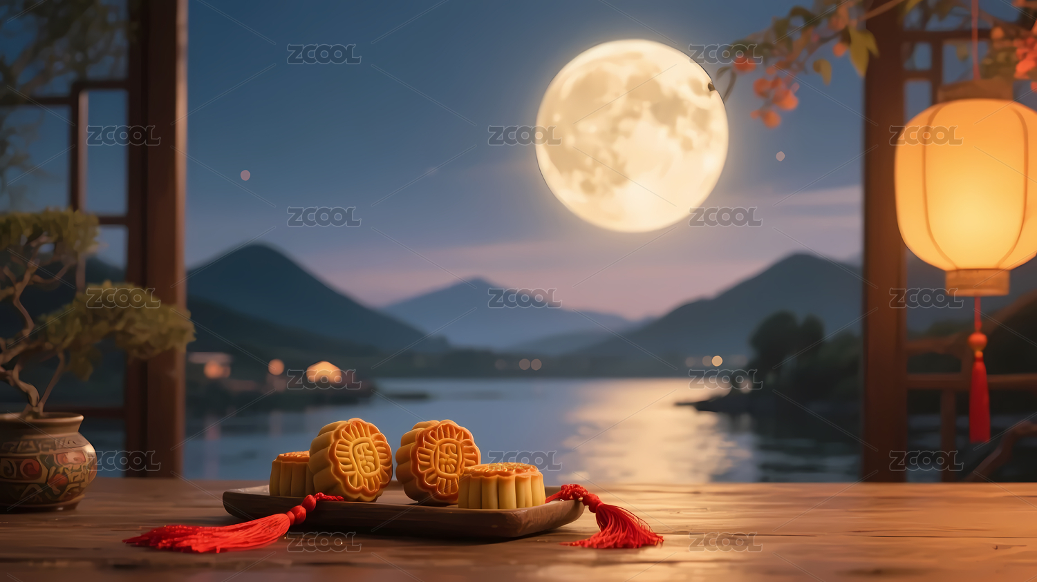 中秋赏月国风中式家居盘中的月饼3D背景
