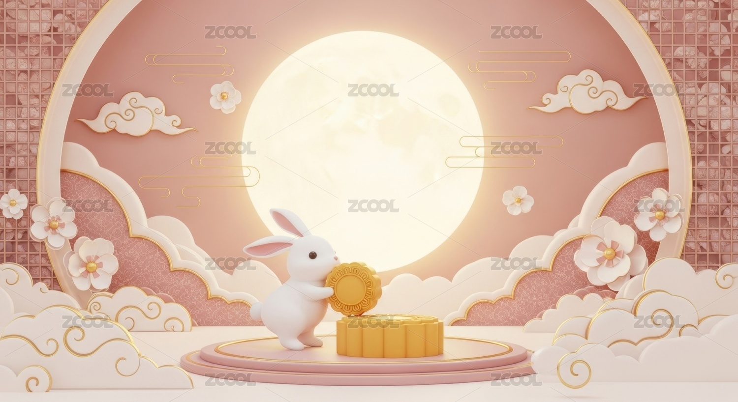 中国传统节日中秋节3D兔子赏月吃月饼插画
