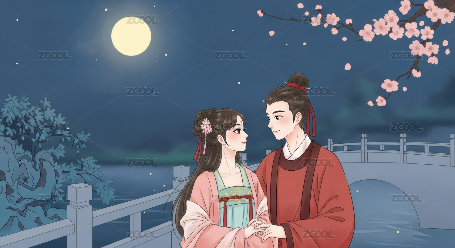 古风情侣月下桥边相会