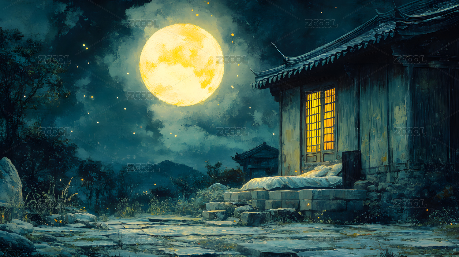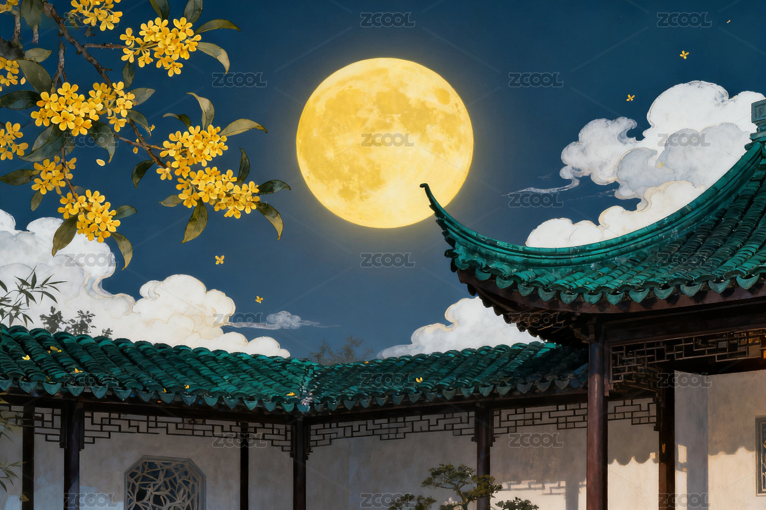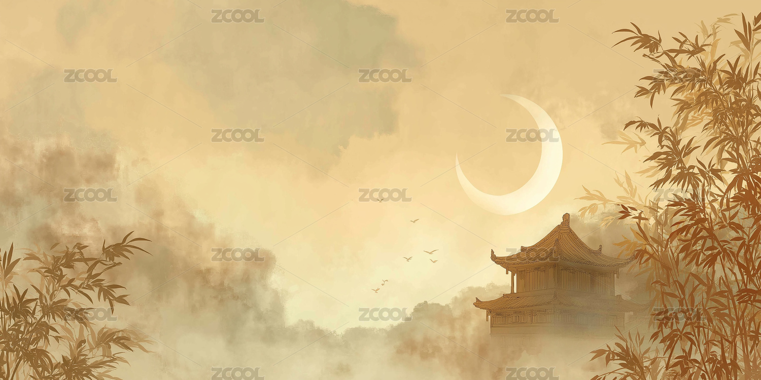 主视觉,月饼,国风,中秋,山水,场景,圆月,糕点,传统,节日