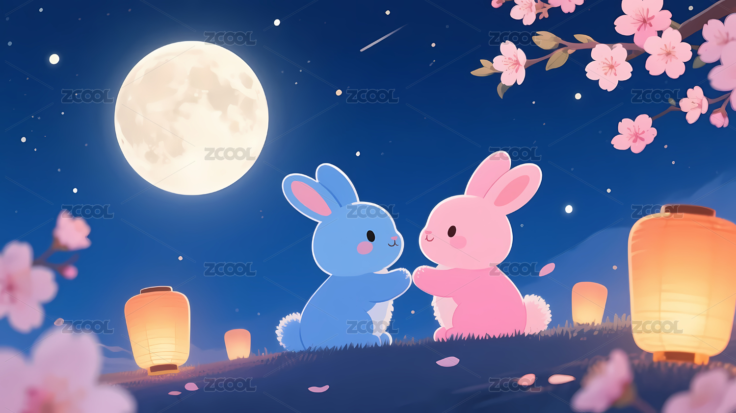 兔子玉兔桂花月亮灯笼月饼可爱扁平插画