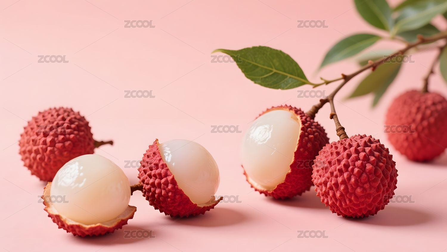 新鲜荔枝与枝叶特写