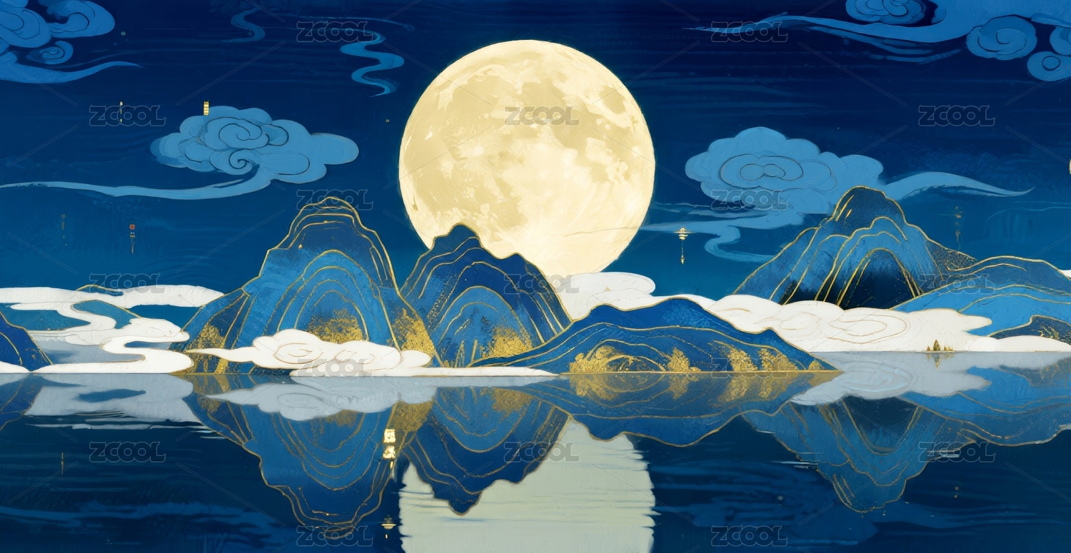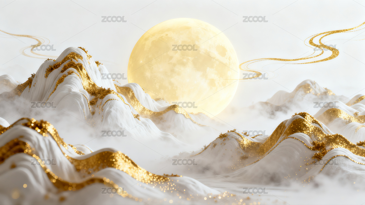 中国风太阳月亮黑金山水云雾背景壁纸新国风