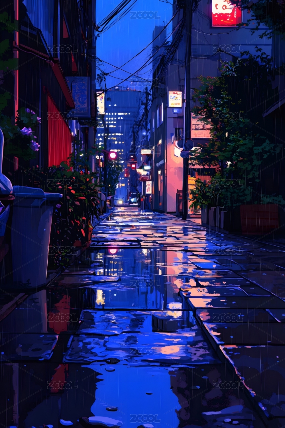 雨夜小巷中的蓝色水洼