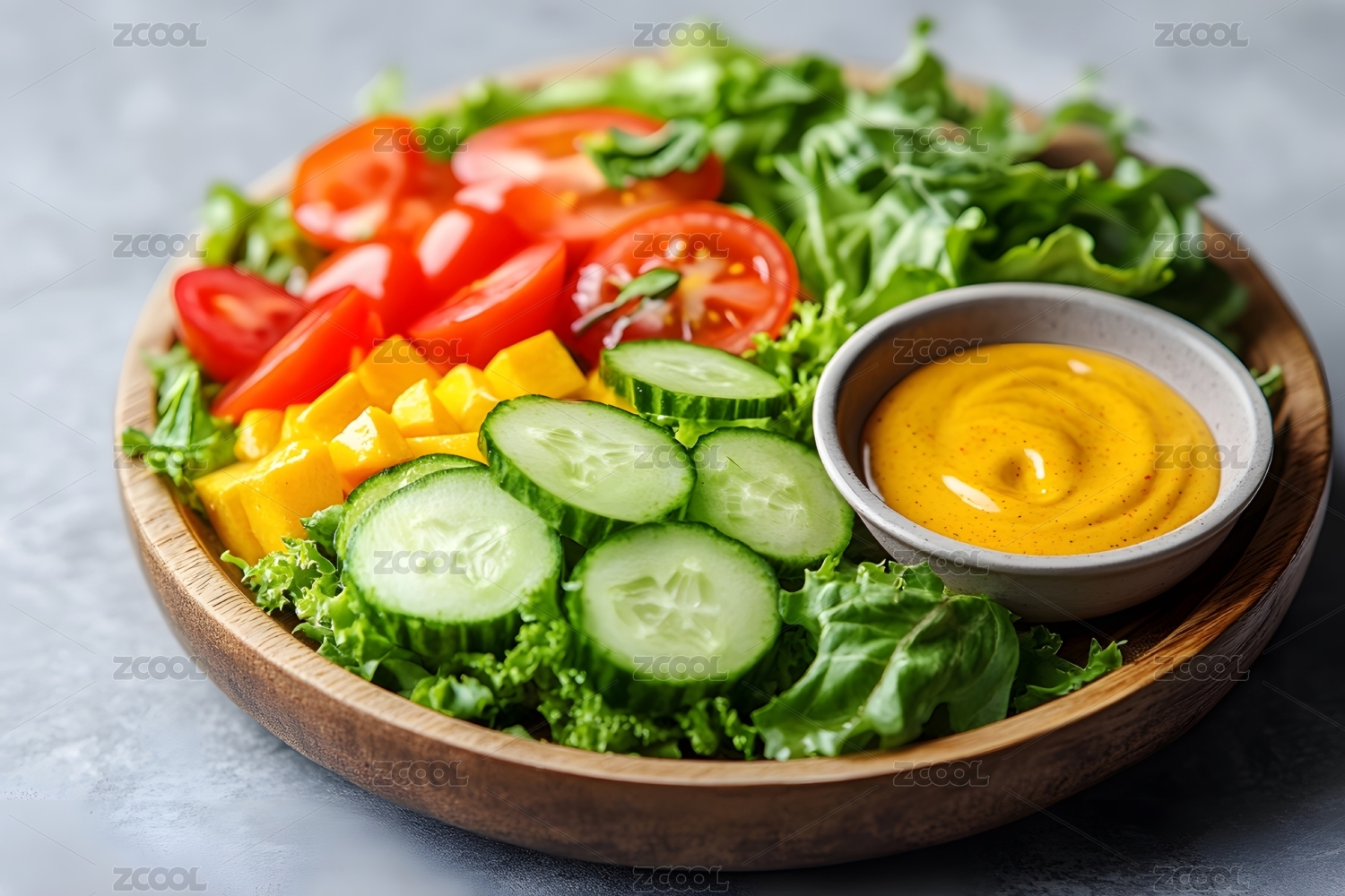 柔光下的蔬菜沙拉与蜂蜜芥末酱