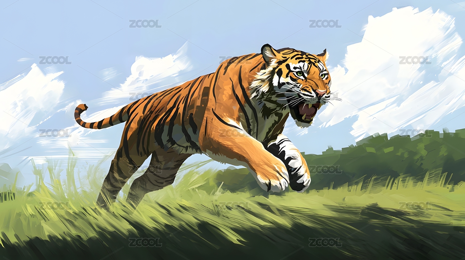 老虎在广阔草原上快速奔跑
